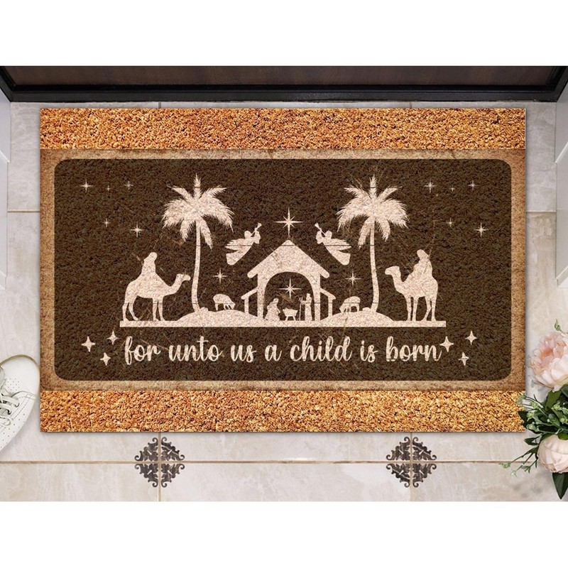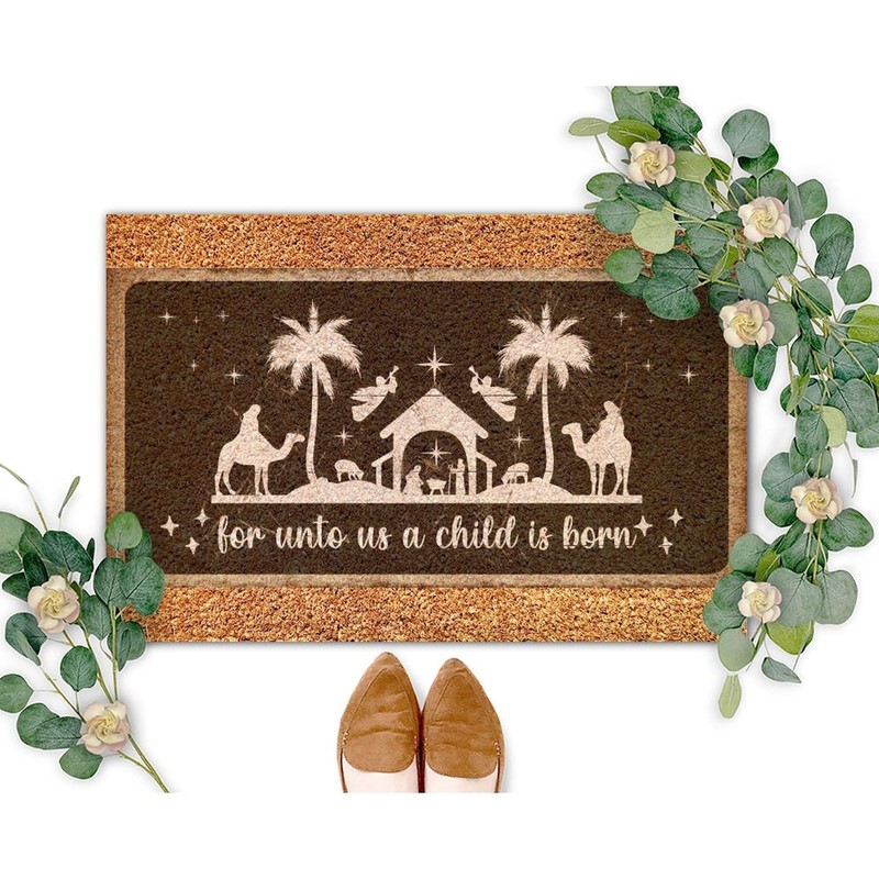 SILYHEART for Unto Us A Child is Born Coir Doormat Nativity Scene Rug Hello Winter Funny Weather Resistant Non Slip Mat for Front Porch Entrance Home Entryway 16x24in