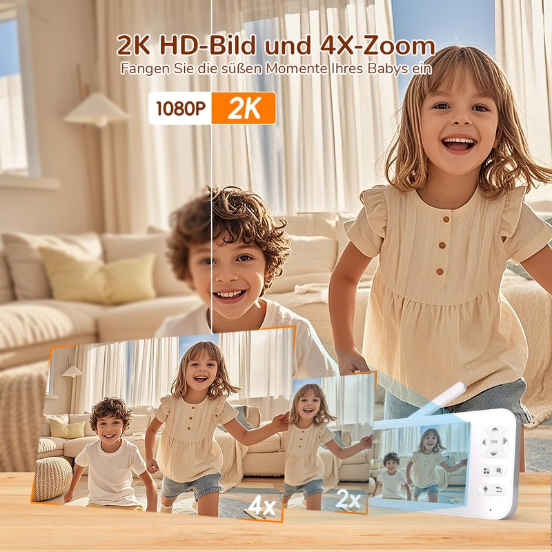 - 【2K/3MP HD-Kamera & 4-facher Zoom】Der Simbailai Babyphone ist mit einer 2K/3MP HD-Kamera ausgestattet (Anzeige auf dem Bildschirm 720P, Anzeige auf dem Smartphone in 2K/3MP HD-Qualität). Die Kamera unterstützt eine 4-fache Zoomfunktion, damit Sie die Details Ihres Babys leichter beobachten und keinen niedlichen Moment verpassen
