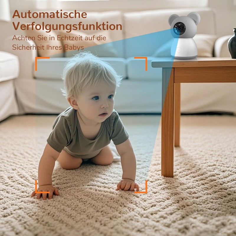 - 【Automatische Verfolgung & 360° Panoramaansicht】Die Überwachungskamera verfügt über eine Weitwinkel-Drehfunktion, die 360° horizontale Drehung und 90° vertikale Drehung unterstützt. Sie können den Kamerawinkel manuell anpassen oder die automatische Verfolgungsfunktion aktivieren, wobei die Kamera automatisch dem Baby folgt und sicherstellt, dass es keine blinden Flecken bei der Überwachung gibt