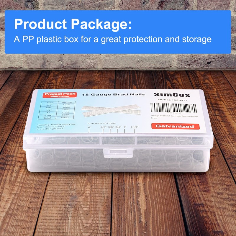 SimCos 5000 pcs 18 Gauge Brad Nails (2/5",5/8",3/4",1",1-1/4 inch) Galvanized 18 GA Nail Gun Nails Assorted and Small Finishing Nails for Pneumatic, Electric Brad Nailer(two kinds of package box)