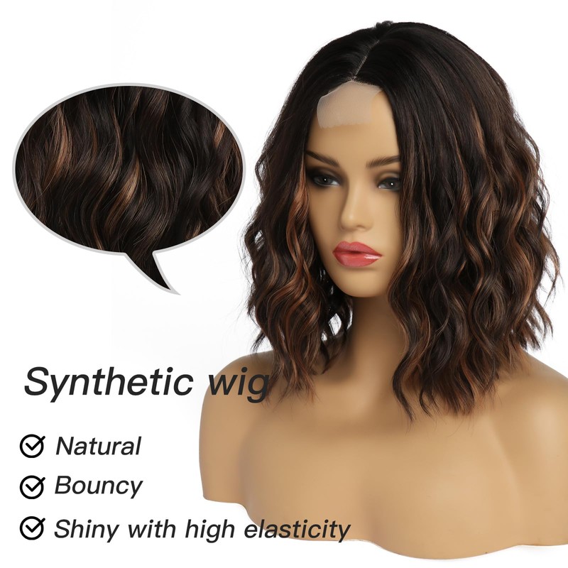 simkaylee Brown Highlight Wigs for Women 14 Inch Short Shoulder Length Middle Part Curly Wavy Bob Blonde Wig Natural Looking Synthetic Heat Resistant Fiber Wig for Daily Party Use