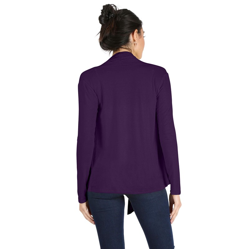 - STYLE - With its loose open drape fall, long sleeves, just-below-the-hips length and wonderfully soft stretch-like touch, our lightweight plum cardigans for women will ensure your constant comfort and ease.