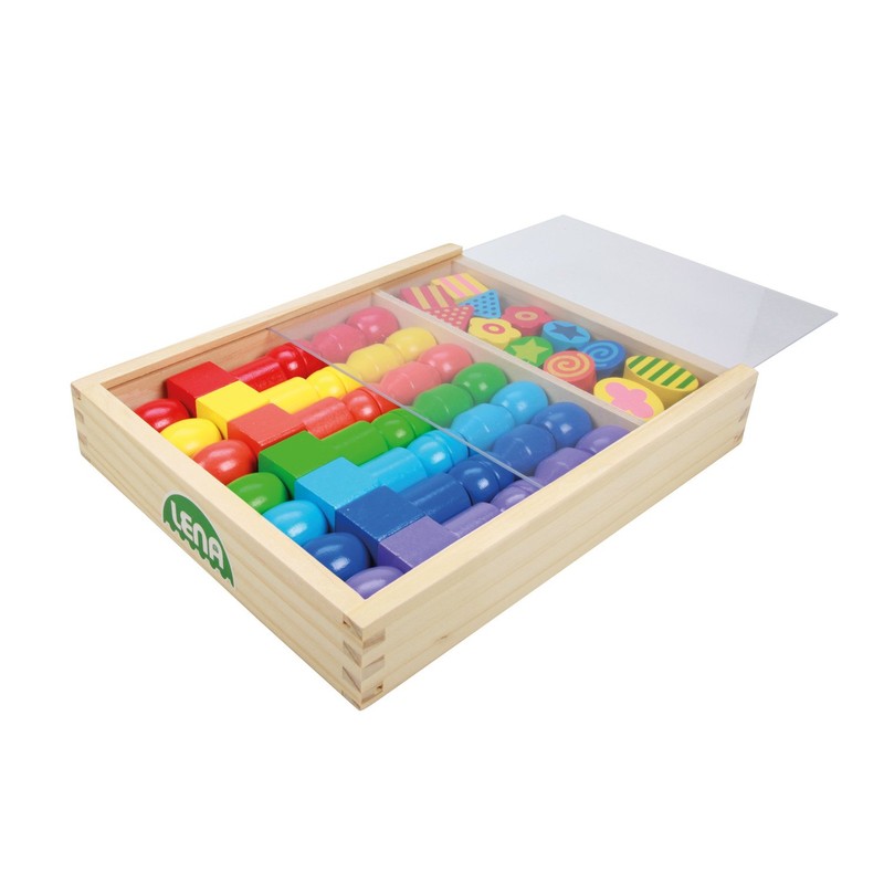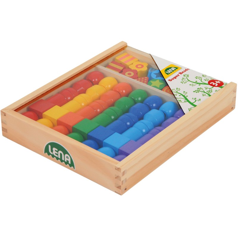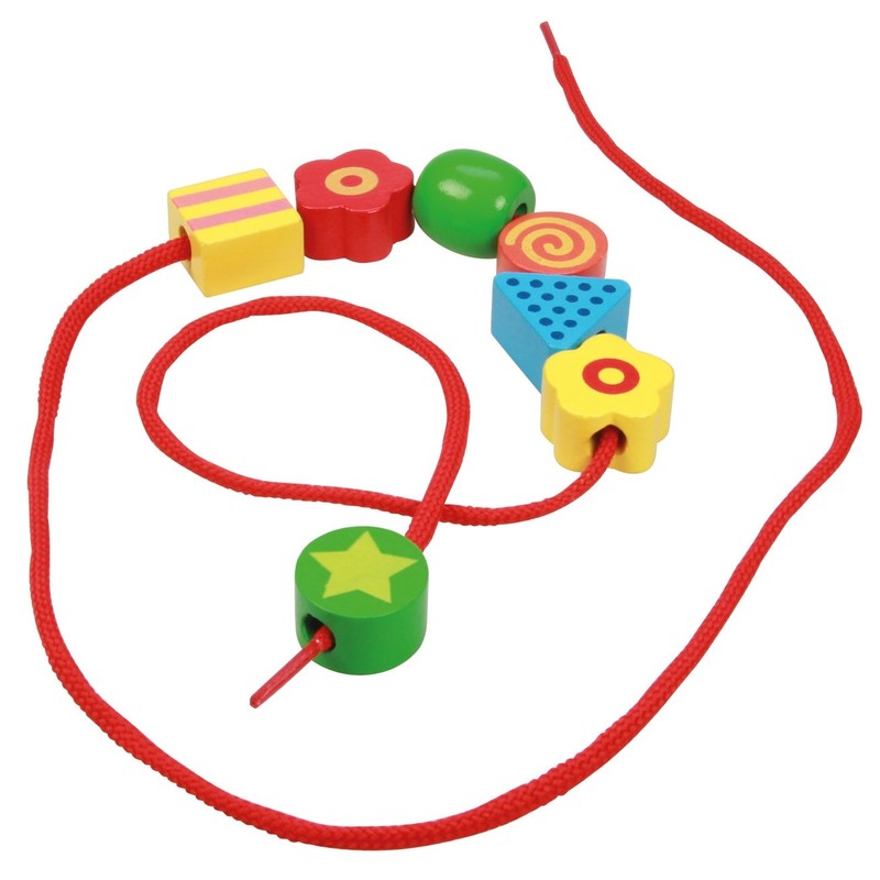 - 54 high-quality painted wooden threading beads in 7 solid colours and 10 shapes.