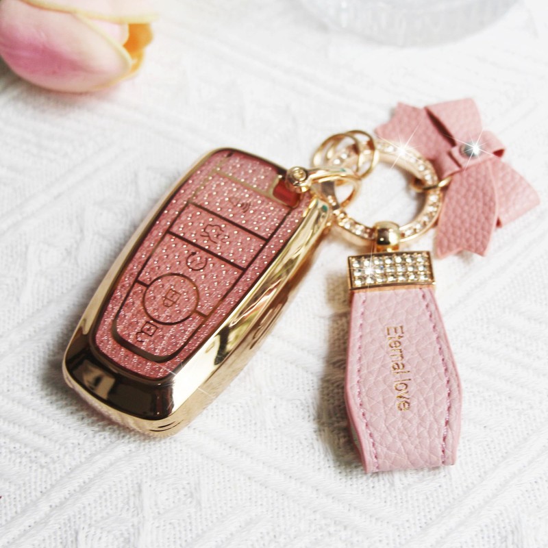 Simocky Key Fob Cover with Diamond Keychain, Compatible with Ford (3/4/5 Buttons—Pink)