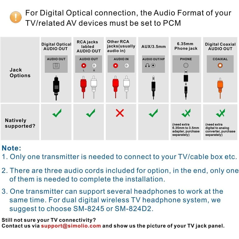 - âïžăWIDE COMPATIBILITY, NO DELAY, LONG RANGEăOptical/RCA/3.5mm Audio Outputs supported. Featuring 2.4GHz FHSS tech, our SM-825D Pro digital wireless TV headsets allow you to binge watch your favorite series on Netflix, catch the highly anticipated game, or pop in your favorite video with high quality sound and in perfect synchronization. One transmitter can support multi headphones simultaneously. RF wireless headphones let you move freely up to 100 ft through walls & ceiling.