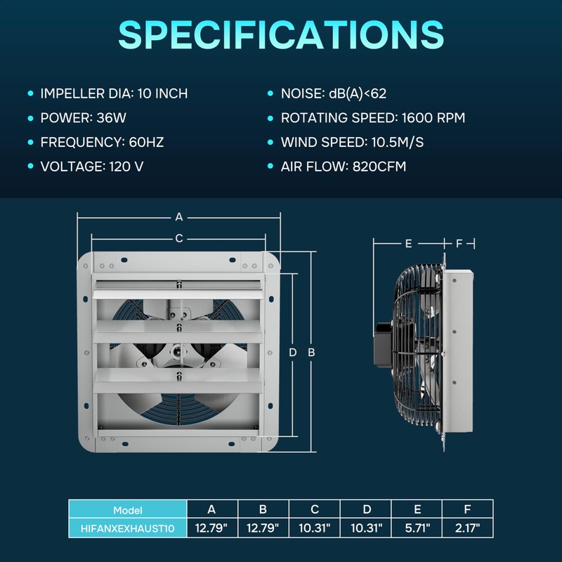 - [SPECIFICATION] Fan: 10 Inch, 1600 RPM, 820 CFM, 120V, 60HZ, 36W, Aluminum louvers and blades, Steel frame