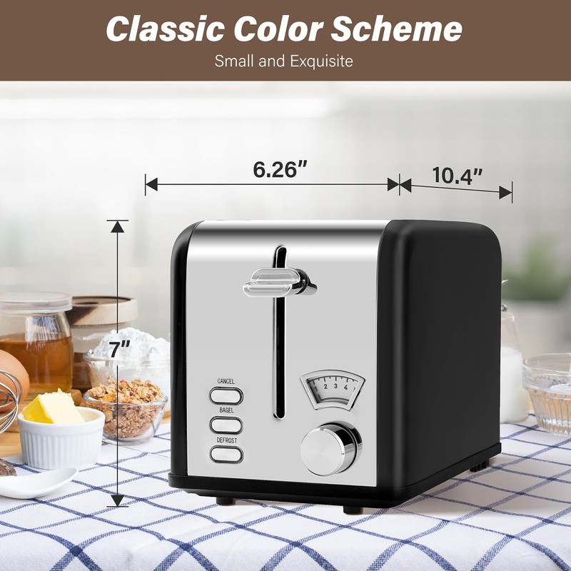 - Compact: Measuring Length 10.4"*Width 6.26"*Height 7", the toaster occupies a small area and fits perfectly into every corner of the kitchen.