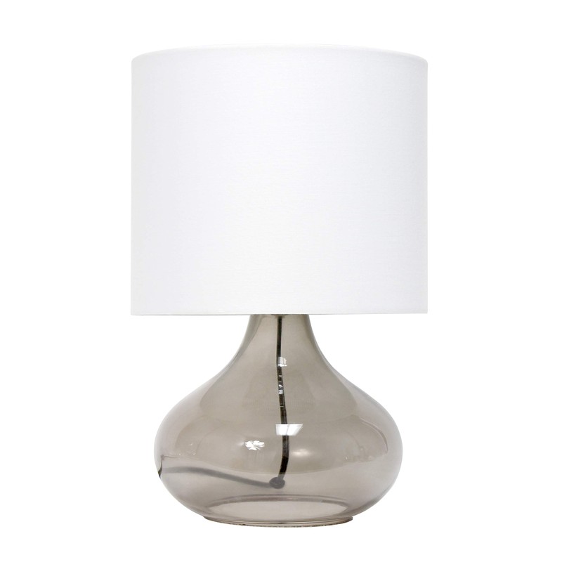 Illuminate your living space with this simple yet stylish glass table lamp. The smoke gray glass raindrop shaped base and white fabric drum shade is the perfect blend of charm to give your home a contemporary and modern upgrade. Perfect for living rooms, bedrooms, kids and teens, college dorms, apartments, nurseries, or offices.