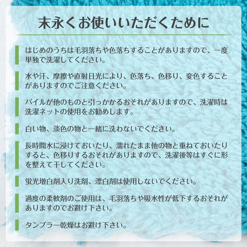 - ● Please choose it alone once for the first time as it may fade or fade. Please note that there may be discoloration, color transfer, or discoloration due to water, sweat, friction or direct sunlight. As the pile may snag other items, we recommend using a laundry net when washing. Do not wash with white or light colored items. If you soak it in water for a long time, or put it on top of other items with a wet surface, the color may transfer to the color, so please immediately adjust the shape after washing. Do not use detergent with fluorescent whitening agent or bleach. Please avoid using excessive fabric softener as it may cause lint or reduce absorbency. Do not tumble dry