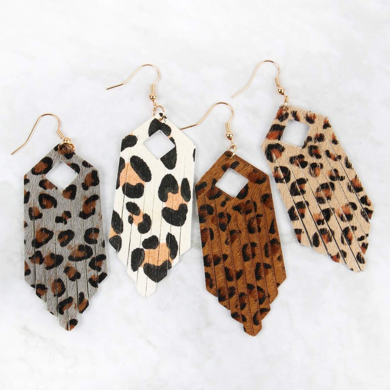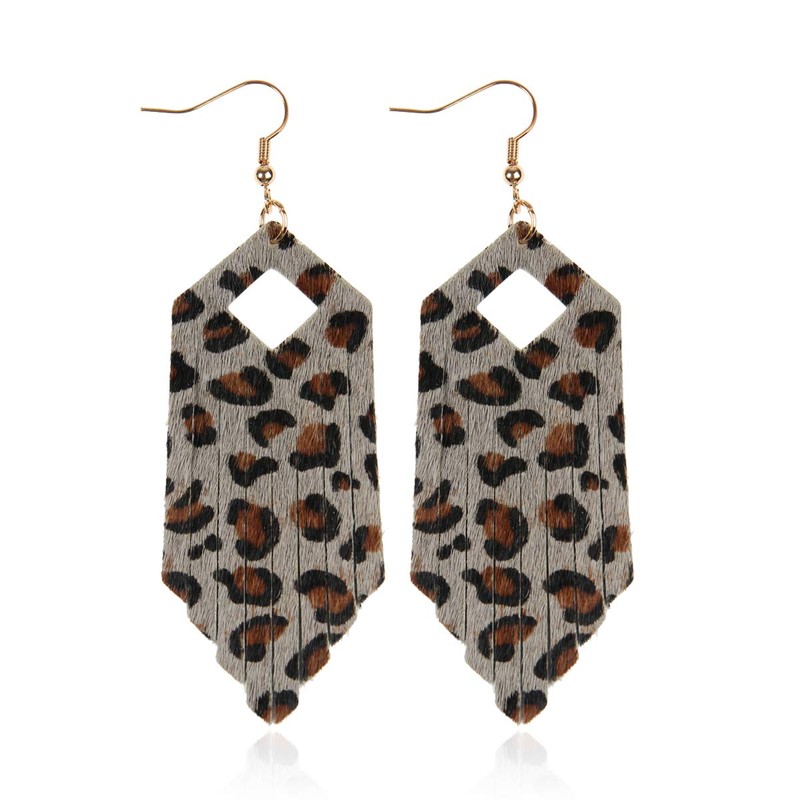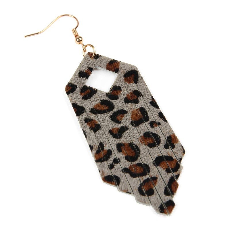Simple Genuine Leather Geometric Drop Earrings - Bohemian Lightweight Hook Dangles Calf Hair Teardrop, Zebra Petal Leaf, Leopard Hoop (Fringe Tassel Leopard - Gray)