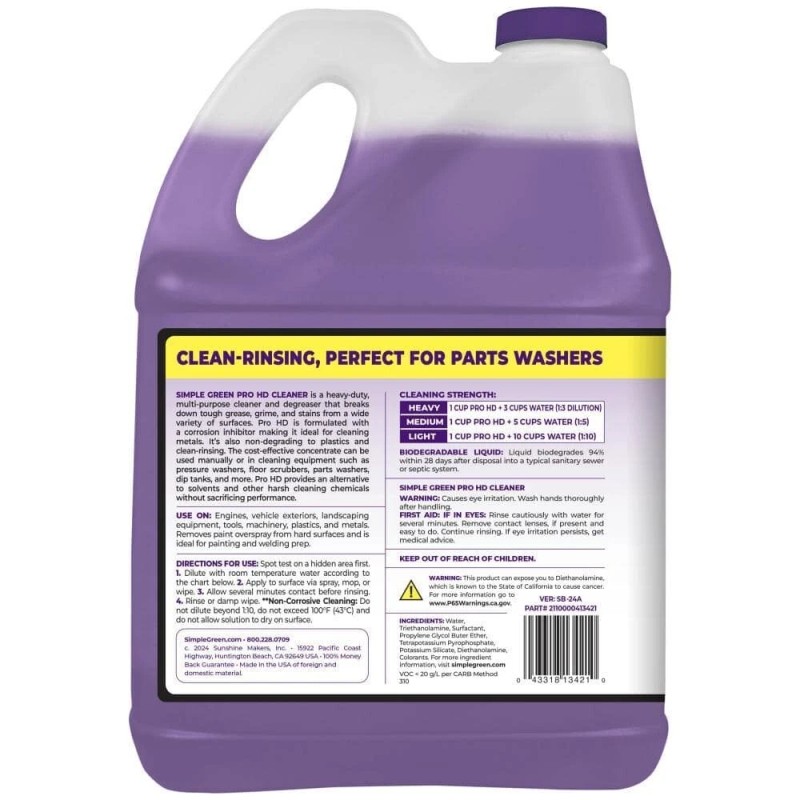 Simple Green Pro HD is a heavy-duty cleaner and degreaser that breaks down tough grease and grime. This powerful formula removes dirt and stains from a wide variety of surfaces including engines, car exteriors, tools, machinery, floors, walls, and more. Formulated with a corrosion inhibitor making it ideas for metals. It's also non-degrading to plastics and clean rinsing. The cost-effective concentrate can be custom diluted for specific cleaning jobs and used in pressure washers, carpet cleaners, floor scrubbers, ultrasonics, dip tanks, and other cleaning equipment. Pro HD provides an effective alternative to solvents and other harsh cleaning chemicals without sacrificing performance.
