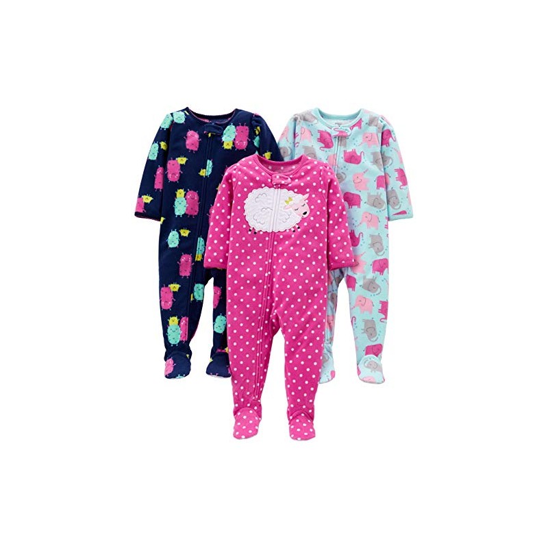 Simple Joys by Carter's Girls' 3-Pack Loose Fit Flame Resistant Fleece Footed Pajamas, Elephant/Lamb/Monster, 24 Months