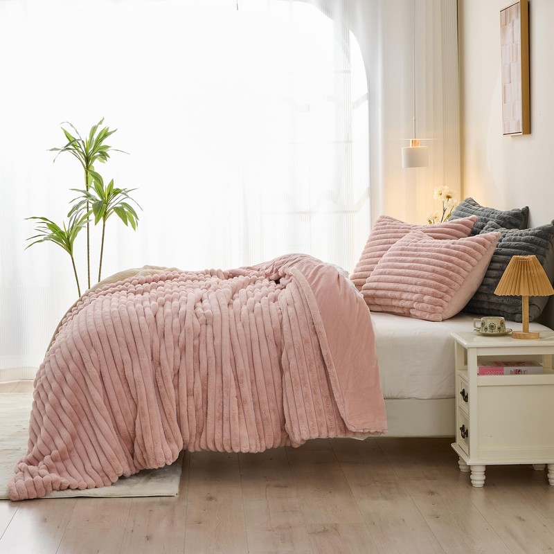 Simple&Opulence Fluffy Faux Fur Comforter Set, Plush Fuzzy Minky Bedding Set, 3 Pieces Warm Soft Comforter Bedding Set for Winter - 1 Shaggy Comforter with 2 Pillow Shams(King, Striped - Pink)