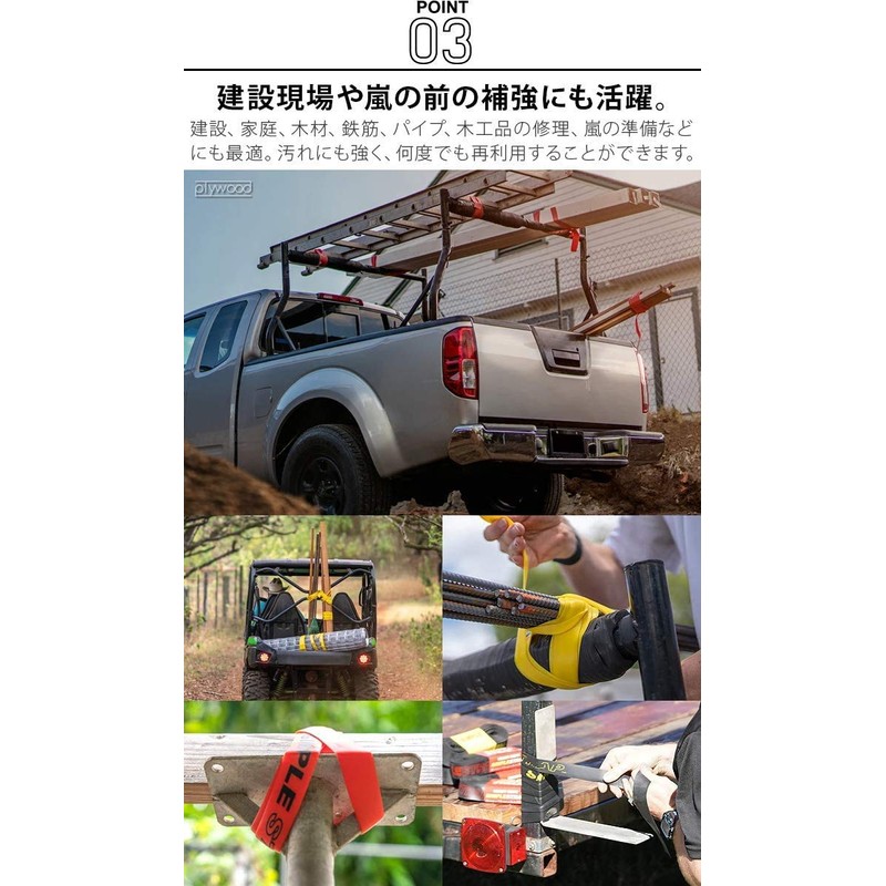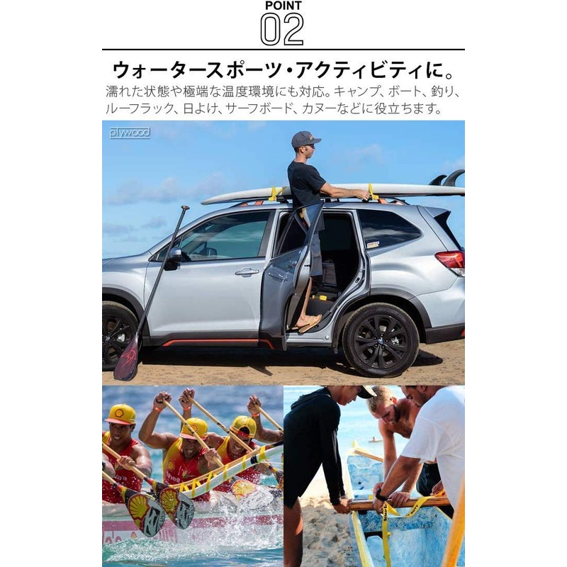 - 【ご注意】正しく使用しないと、人身傷害または物的損害の恐れがあります。素材の劣化や不適切な使用による事故にメーカーは責任を負いません。/使用前に必ず本品を点検してください。損傷、または摩耗の著しい兆候がある場合は使用しないでください。/車両牽引に使用しないでください。 板やマットレスなど風にあおられるような大きな面をもつような物の運搬に使用しないでください。/1回の巻き付けで最大負荷(800lbs)を超えないようにしてください。/常にテストして対象物が安全に固定されていることを確認してください。/本品は耐光性がありますが寒さや熱、雨風等、屋外に長時間さらされると劣化します。室内に保管してください。