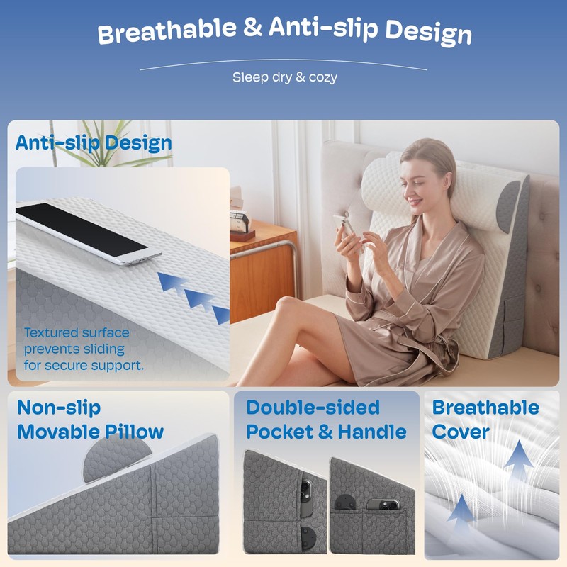 - MULTIPLE USAGE SCENARIOS: It's not only a bed wedge, but also back pillow for bed sitting up or on the couch.It is the perfect companion for reading, using your phone, working, watching TV, or simply relaxing. Dual side pockets are designed to hold your glasses, remote control, phone, and other belongings, so you don't have to worry about waking up and not being able to find them.