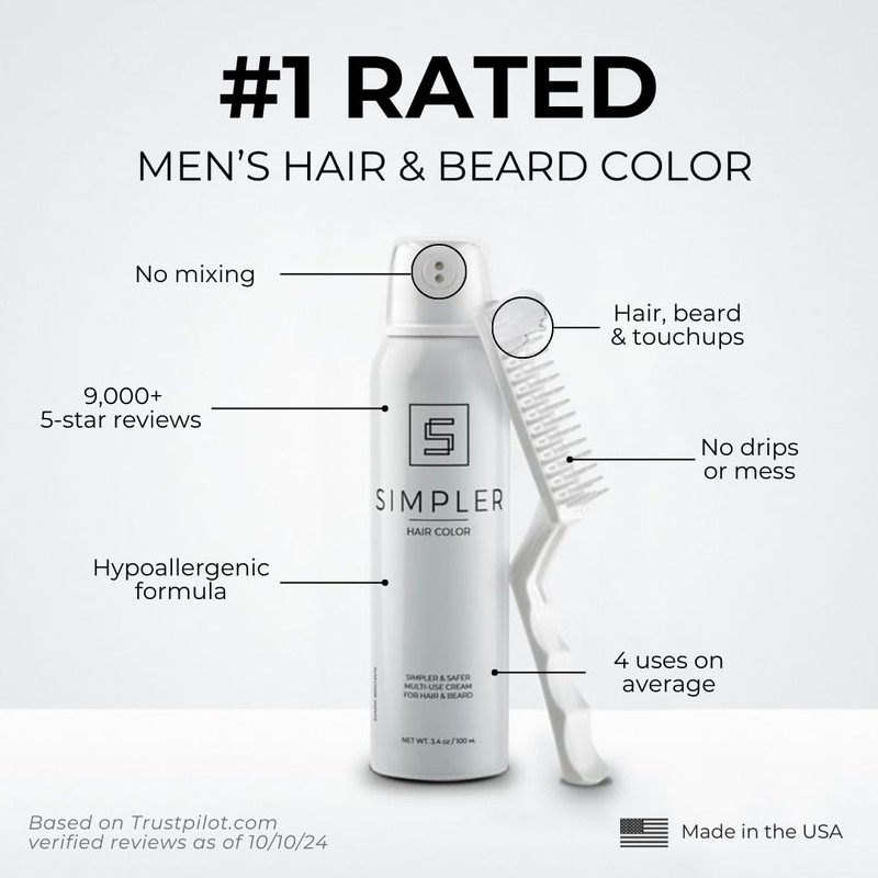- No Mixing, No Mess: Put on the gloves, pick up the can, and dispense the cream onto the included brush. Brush it into your hair, beard, or mustache. One of our SIMPLER coloring kits fills more than 16 combs (the equivalent of 4 single use drug store dye kits) making this the best quality AND the best value.