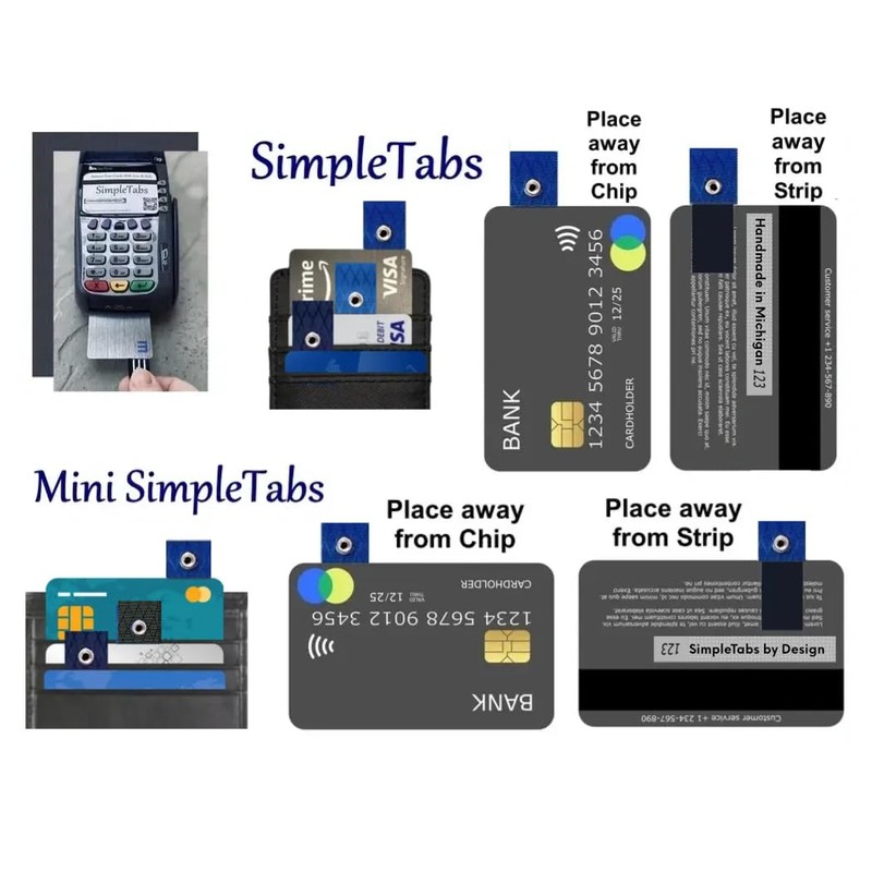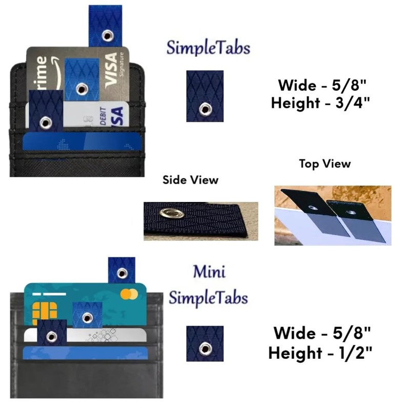 • (SIZE) Do you need SimpleTabs or Mini SimpleTabs? The difference between a SimpleTab and a Mini SimpleTab is the ribbon length. The Mini SimpleTab was designed for smaller wallets, men’s wallets, and wallets where the cards are removed towards the middle of the wallet. ✂ Ribbon Measurement ✂ ~ SimpleTabs - Height 3/4", Wide 5/8" ~ Mini SimpleTabs - Height 1/2", Wide 5/8".