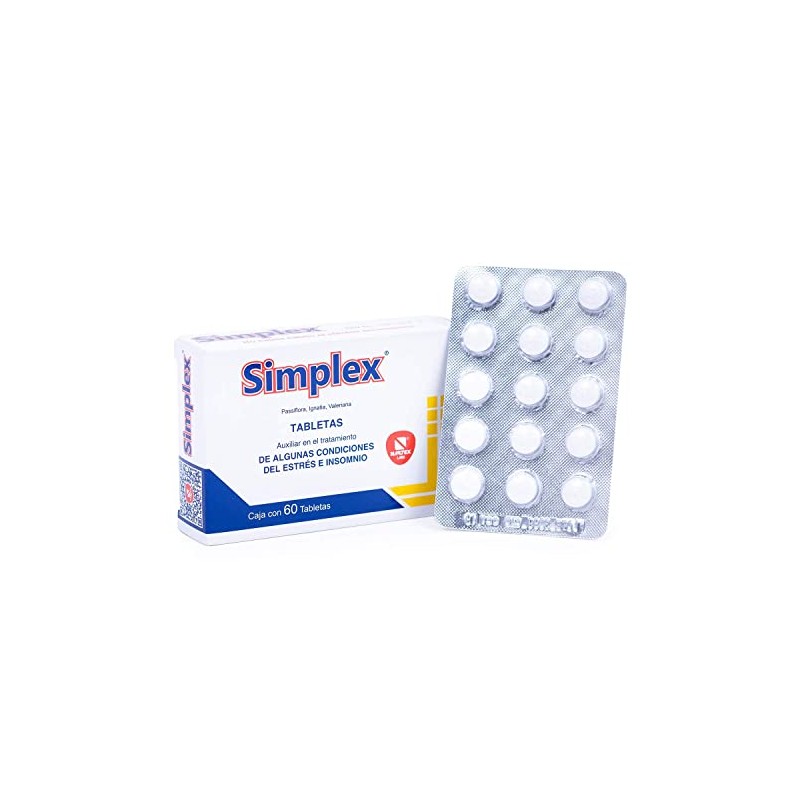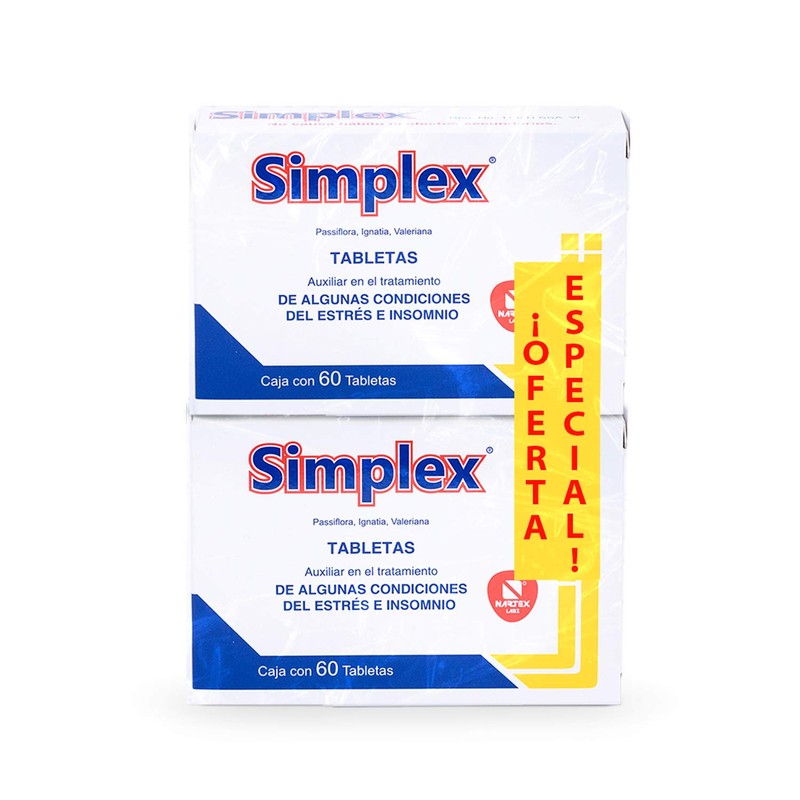 Simplex C/60 C/U Tabletas, Simplex, Solución Natural en el tratamiento de algunas condiciones de Estrés, Insomnio y Ansiedad 2 Cajas.
