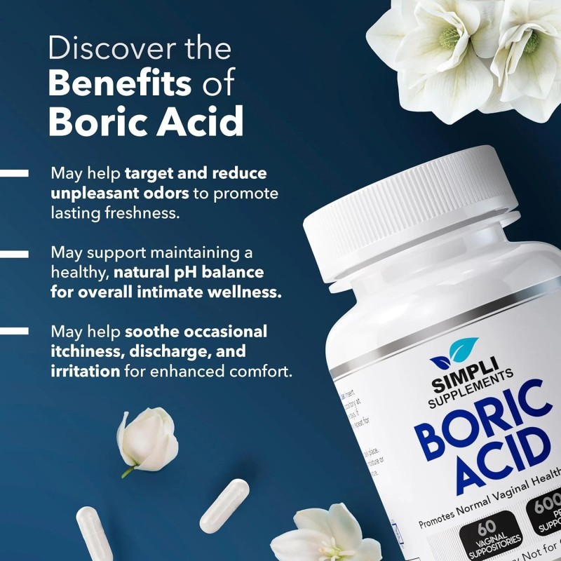 Simpli Supplements 60 Boric Acid Suppositories for Vaginal Health - Ph Balance & Natural Remedy