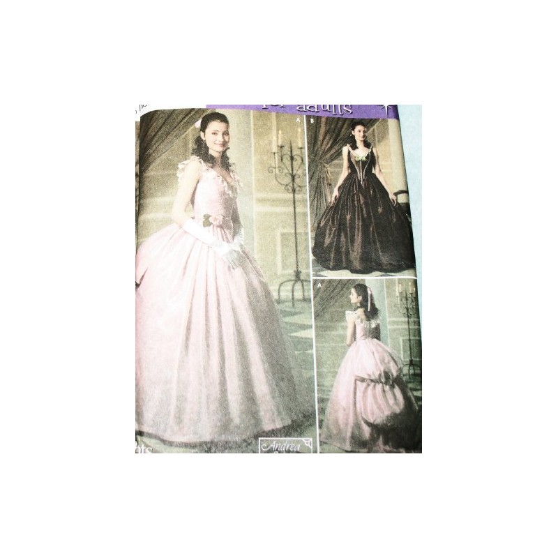 - SewinNew, Uncut, Out of Print, Rare sewing pattern and instructions to make Misses1800s Era gowns in two styles. Both styes are sleeveless, with V neckline. One variation has full flared floor length skirt. Second verision, pictured in pink, has flared skirt with gathered train. Makes misses sizes 14, 16, 18, 20