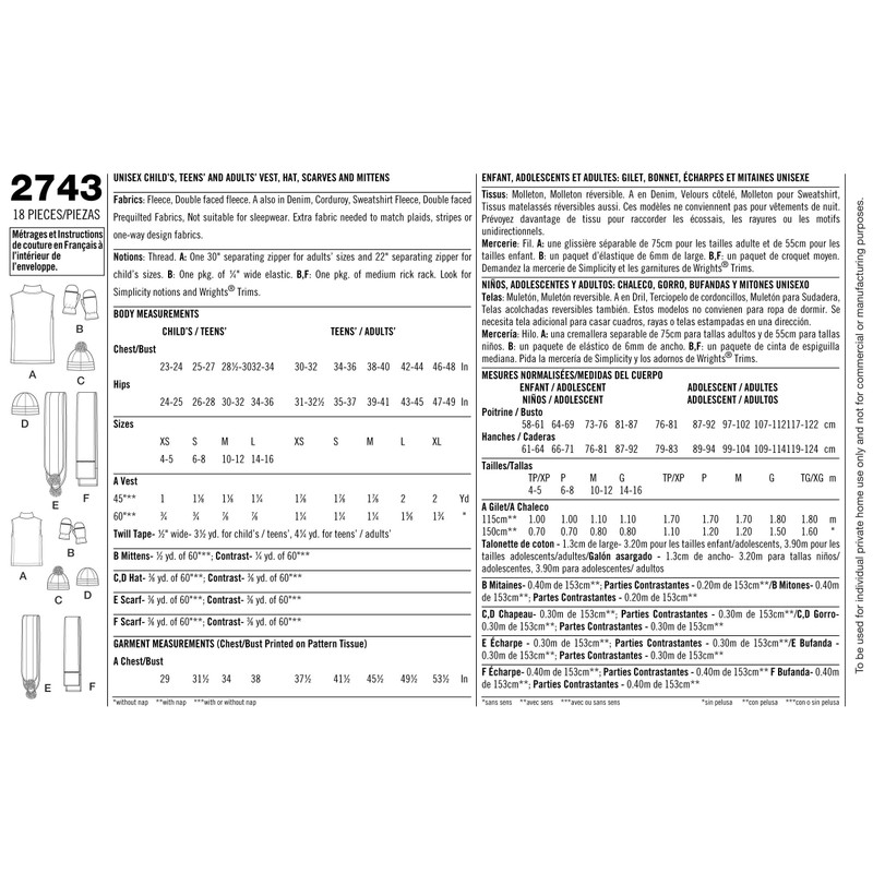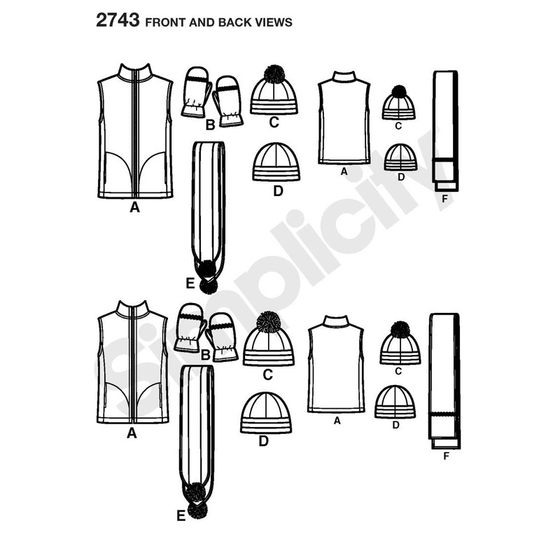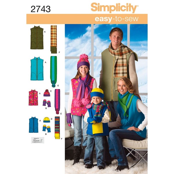 Simplicity Sewing Pattern 2743 Miss/Men/Child Vest, Hat, Scarves and Mittens, A (XS - L / XS - XL)