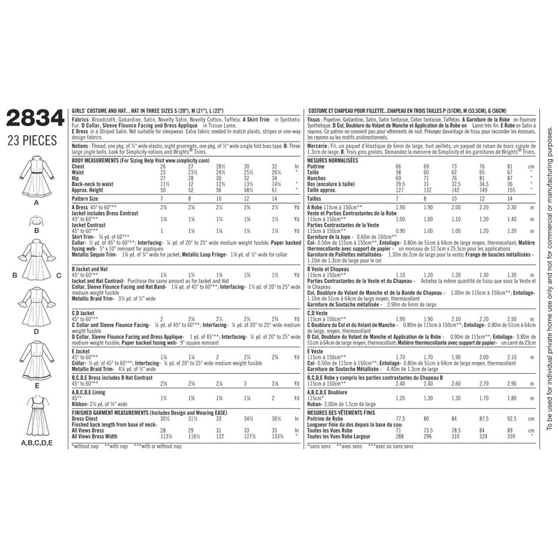 - Girl costumes in size a (7-8-10-12-14), simplicity pattern 2834