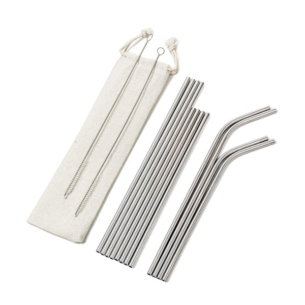 - This set includes (4) 10” straight stainless steel straws, (4) 10” bent stainless steel straws, (2) 8.5” straight stainless steel straws, (2) 8.5” bent stainless steel straws, (2) nylon cleaning brushes, and (1) storage pouch.