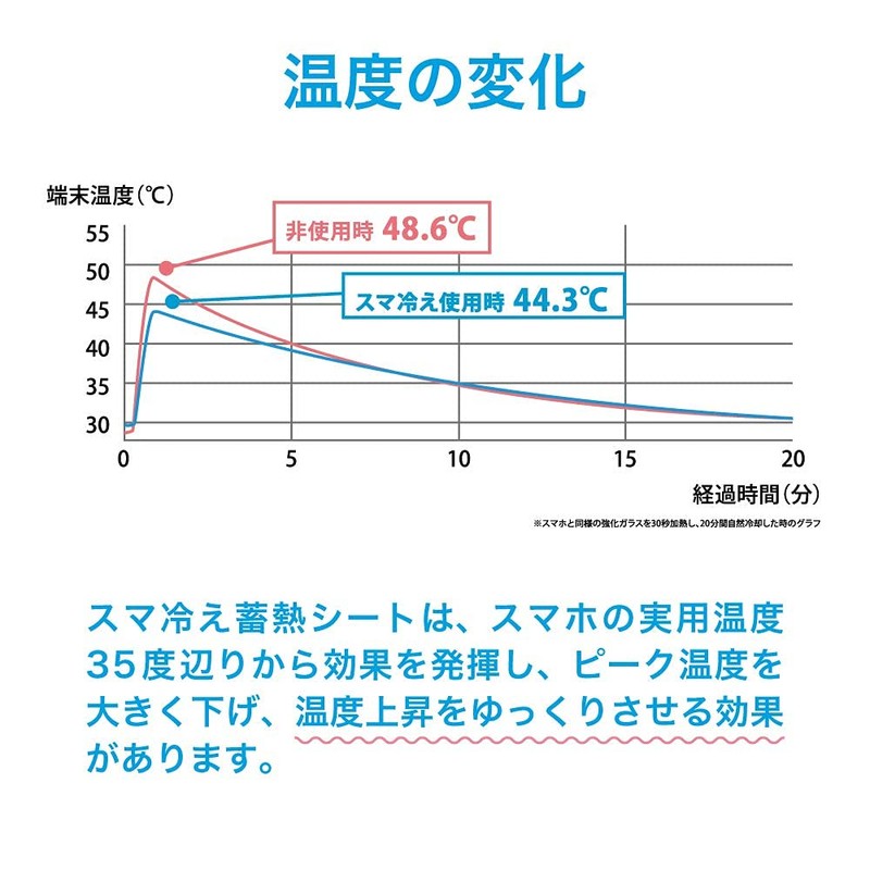 - Ideal for watching videos and playing games. Moderate rise in temperature: The sudden rise in temperature when charging while watching videos, playing games, etc., can severely damage the battery.However, by applying this Smart Cooling Sheet, the heat generated during peak periods is suppressed and the temperature is gently lowered, preventing thermal degradation of the battery
