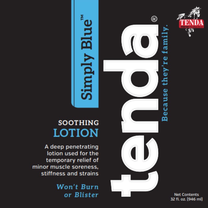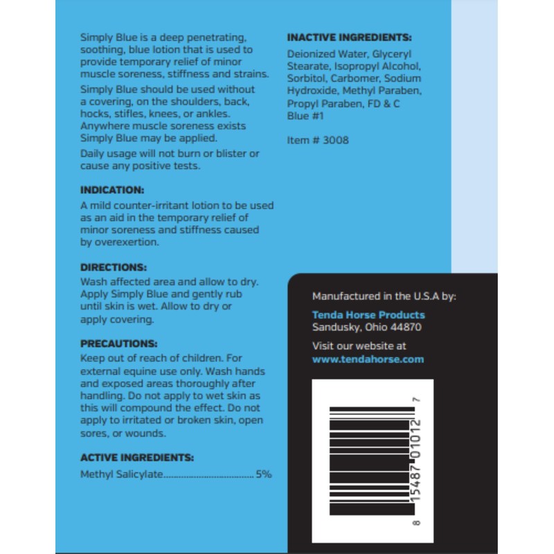 A Deep Penetrating Lotion Used for the Temporary Relief of Minor Muscle Soreness, Stiffness and Strains Simply Blue Lotion is a pleasant smelling, soothing lotion used as an aid in the temporary relief of minor stiffness and soreness caused by overexertion. Simply Blue Lotion may be used on the back, knees, hocks, shoulders, legs and ankles with or without a covering. Simply Blue Lotion is suitable for daily use in all classes of horses, will not test and will not burn or blister.