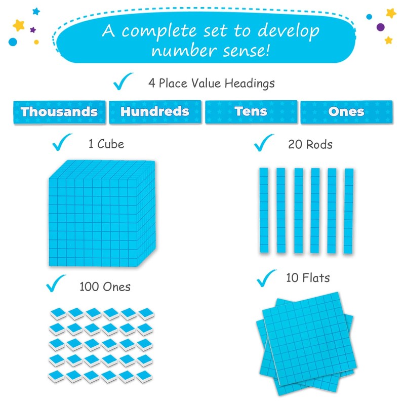 - A complete set of place value magnets; each set of Base 10 Blocks includes 4 magnetic place value headings, 1 blue cube, 10 blue flats or hundreds, 20 blue rods or tens, 100 blue units or ones; perfect math manipulatives kit for 1st, 2nd, 3rd grade; master base 10 concepts with ease, play games, have fun learning math; jumbo size for classroom whiteboards