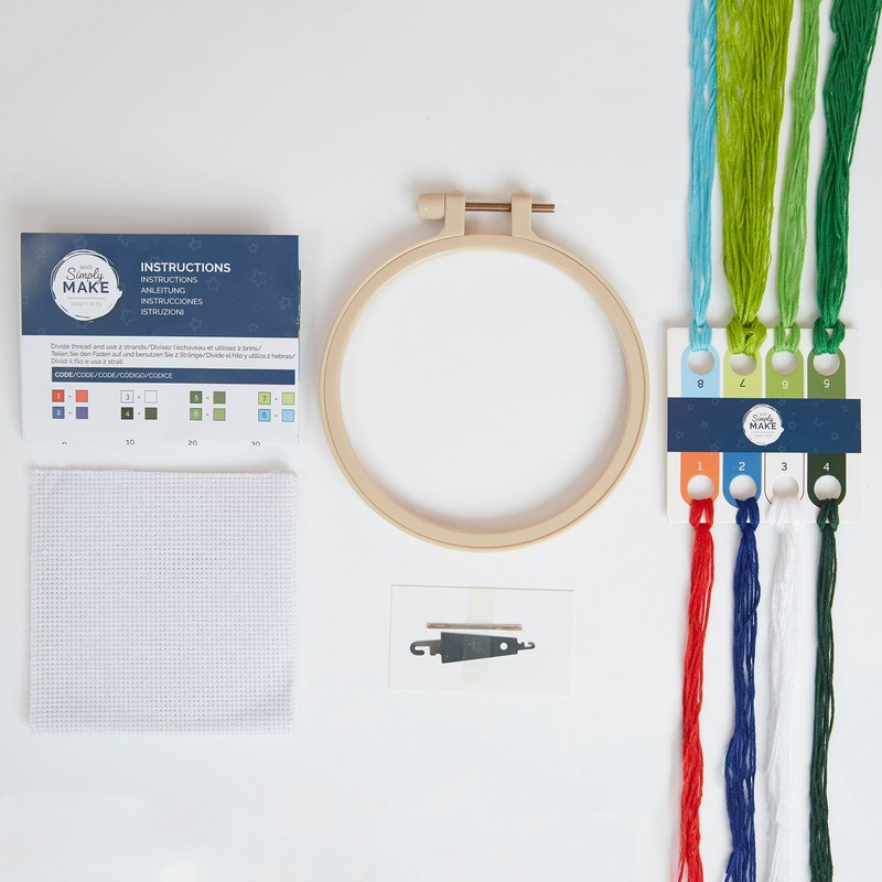 - CONTENTS The kit features 125mm plastic hoop, colourful threads, stitching fabric, needles, threader, and a helpful set of instructions. A perfect DIY craft kit for beginners, all supplies included