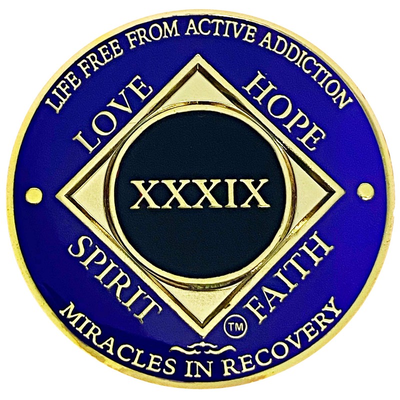 Simply Minimal NA 31-40 Years Medallions, Narcotics Anonymous Coins, Gold Color Plated Recovery Token (39 Year Purple, Black, Gold)