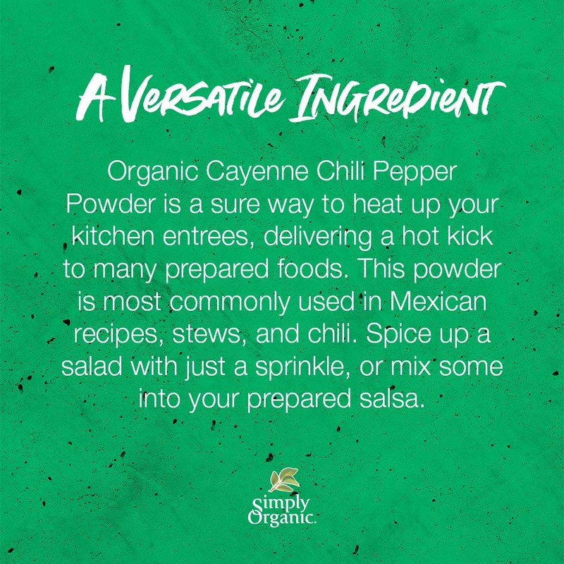 - CHILI PEPPER - Simply Organic Cayenne Pepper contains nothing but pure, organic, ground cayenne peppers (Capsicum annuum). Rich, earthy color. Drool-worthy aroma. Lively taste that packs a POW at 35,000 heat units.