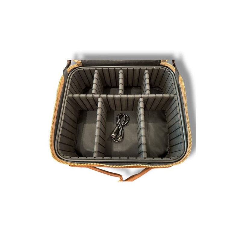 Azur Blue Leather Makeup Travel Case With LED Mirror Light By Simply Southern features a leather make up case, zippered closure, rechargeable LED light up mirror with three brightness and warmth settings, straps to hold the bag open while using mirror, adjustable interior compartments lined with foam, and a metal Simply Southern logo. Measures 10" x 4" x 9". Made of 60% PU 40% Polyester Leather.
