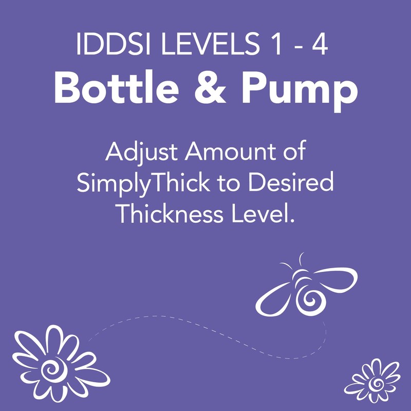 - SIMPLE APPLICATION - For every 4 ounces of liquid, add 1 pump to get the consistency of IDDSI Level 2 -Mildly Thick (Nectar Consistency), 2 pumps for IDDSI Level 3 - Moderately Thick (Honey Consistency), and 4 pumps for IDDSI Level 4 - Extremely Thick (Pudding Consistency). For IDDSI Level 1 - Slightly Thick Consistency, add 1 pump to 6 ounces of beverage.