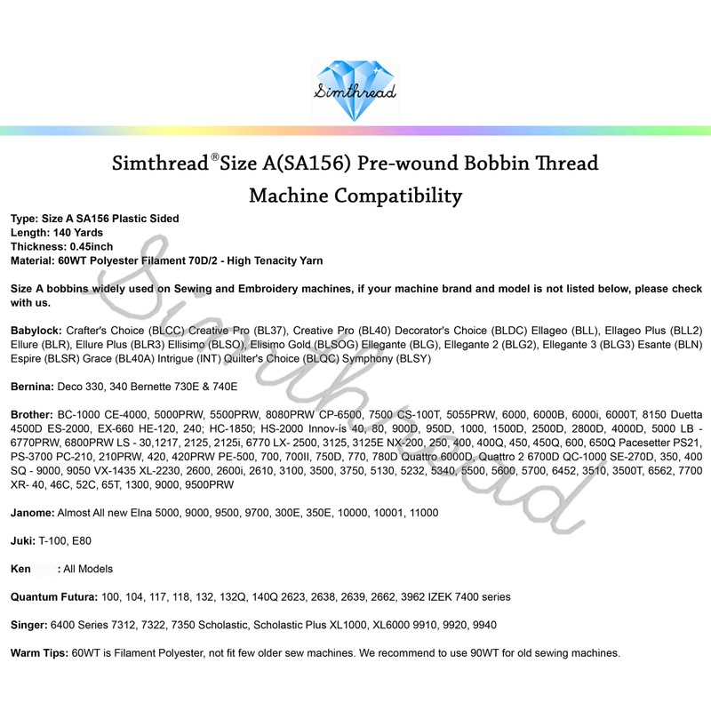- ✔ Size A Class 15 (SA156) - Colorful, pre-wound bobbin threads fit most standard embroidery and sewing machines such as Babylock, Janome, Juki, Elna, Quantum Futura, Singer.