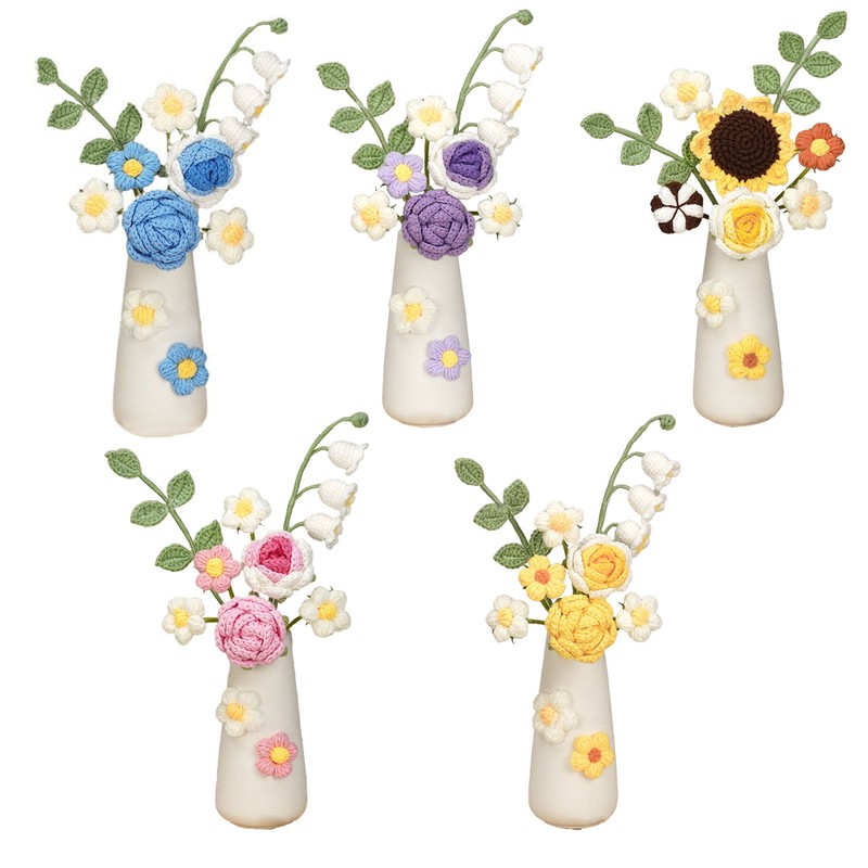 1、This woolen flower is purely handmade, each one is carefully knitted and crocheted, showing a unique artistic beauty. Each flower is unique, highlighting the unique value of handmade art. 2、The woolen flower is highly simulated and lifelike, making it almost indistinguishable from the real flower from a distance. This makes it able to maintain a long‑lasting beauty without worrying about fading, molting and other problems. 3、Compared with traditional flowers, woolen flowers are more diverse and creative in shape and color. Each flower is endowed with the designer's unique creativity, with a strong sense of art and decorative, which can add a unique style to the home environment. 4、Due to the use of woven wool, these flowers are extremely durable and not easily damaged or deformed. They will keep their perfect appearance for a long time, will not be affected by weather, humidity and other factors, and do not need to be replaced or maintained frequently, making them a reliable and long‑lasting product. 5、Woolen flowers with ceramic vase become a beautiful table flower decoration that can be embellished in a variety of interior environments such as living room, bedroom, study and so on. They not only enhance the ambiance and beauty of the space, but also convey a poetic and romantic atmosphere, making them a unique gift choice.