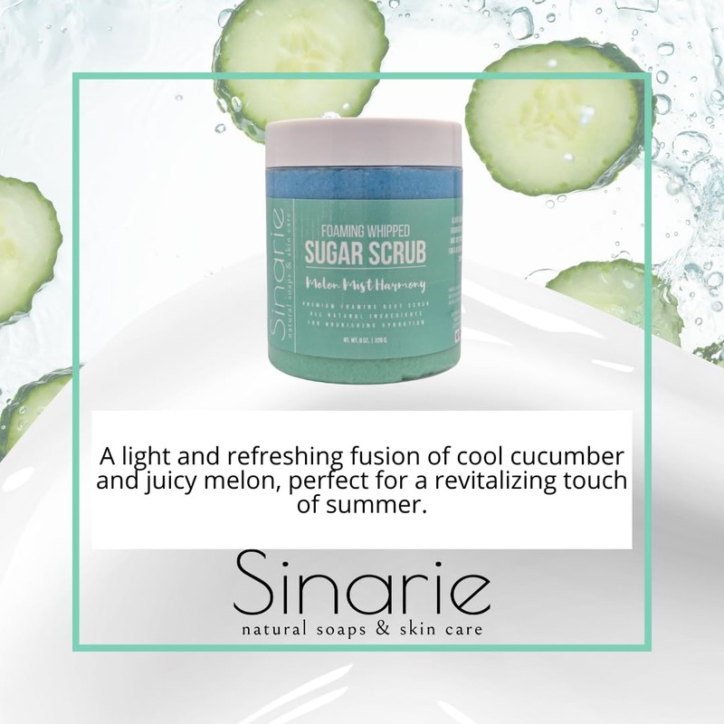 Sinarie Foaming Whipped Sugar Scrub – 8 oz | Gentle Exfoliant with Mango Butter & Coconut Oil for Smooth, Glowing Skin (8 oz., Melon Mist Harmony)