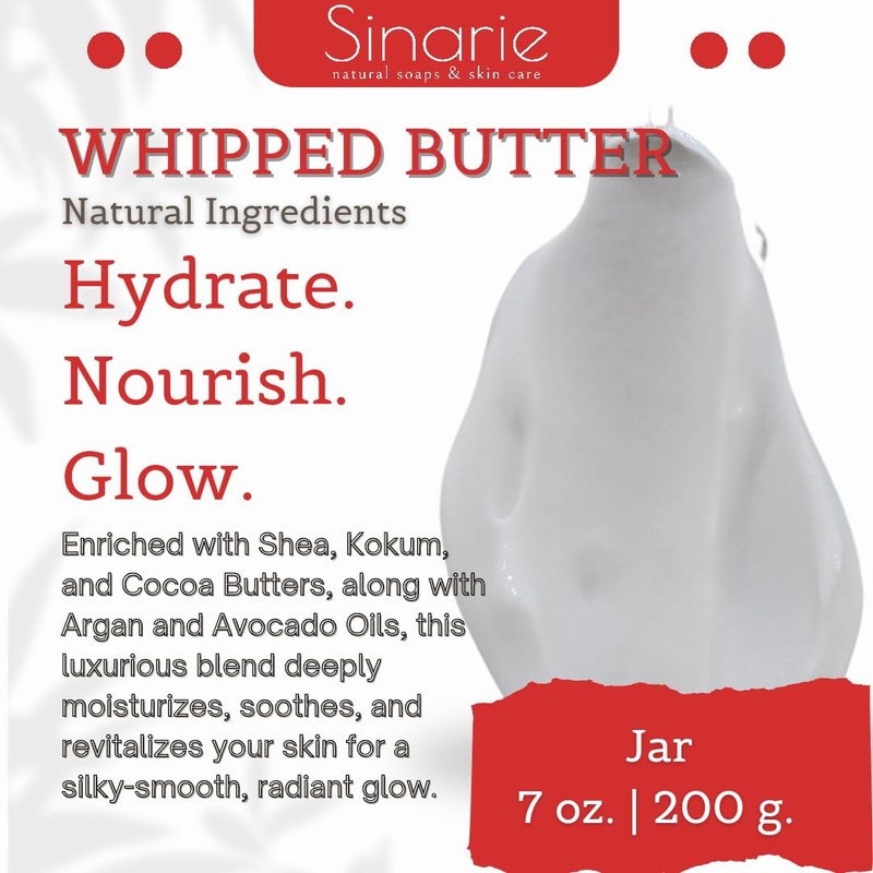 Discover the ultimate in skin hydration with Sinarie Whipped Body Butter, a luxurious blend designed to pamper your skin. Infused with the nourishing power of argan oil, shea butter, and cocoa butter, this rich formula deeply moisturizes and revitalizes, leaving your skin soft, smooth, and radiant. Experience the perfect harmony of natural ingredients like avocado oil and kokum butter, which enhance the moisturizing benefits and provide long-lasting hydration. Ideal for all skin types, this body butter is your go-to solution for silky-smooth, glowing skin. Transform your skincare routine with Sinarie Whipped Body Butter. Packaged in a convenient 7 oz. jar. Order now and indulge in the luxurious care your skin deserves!
