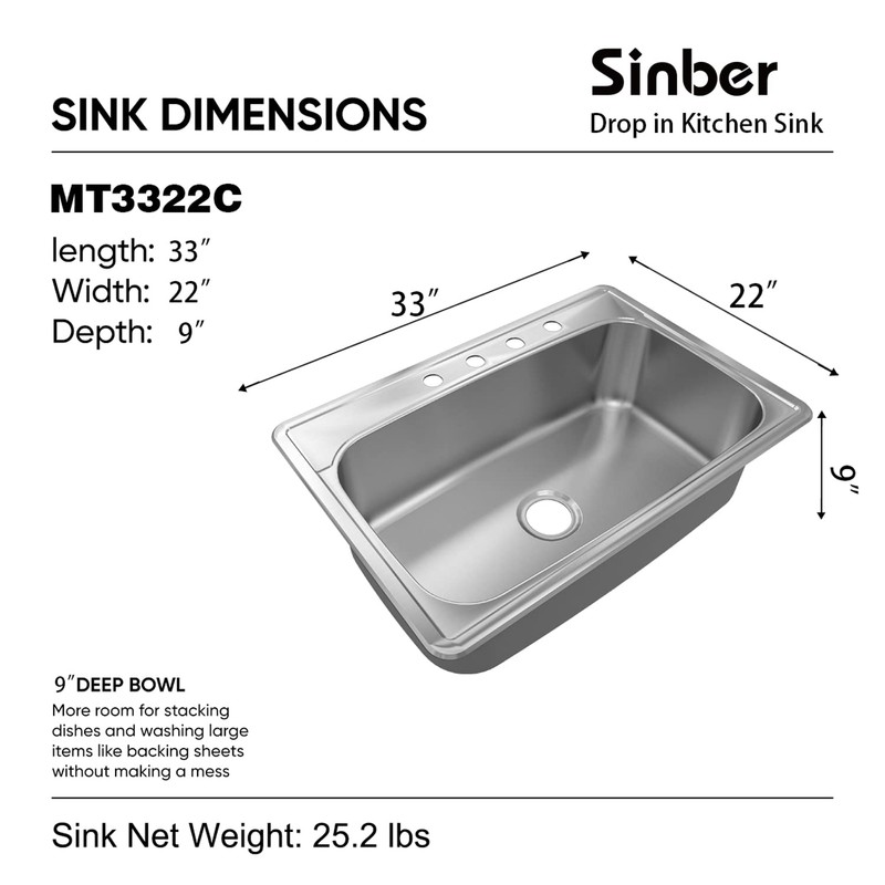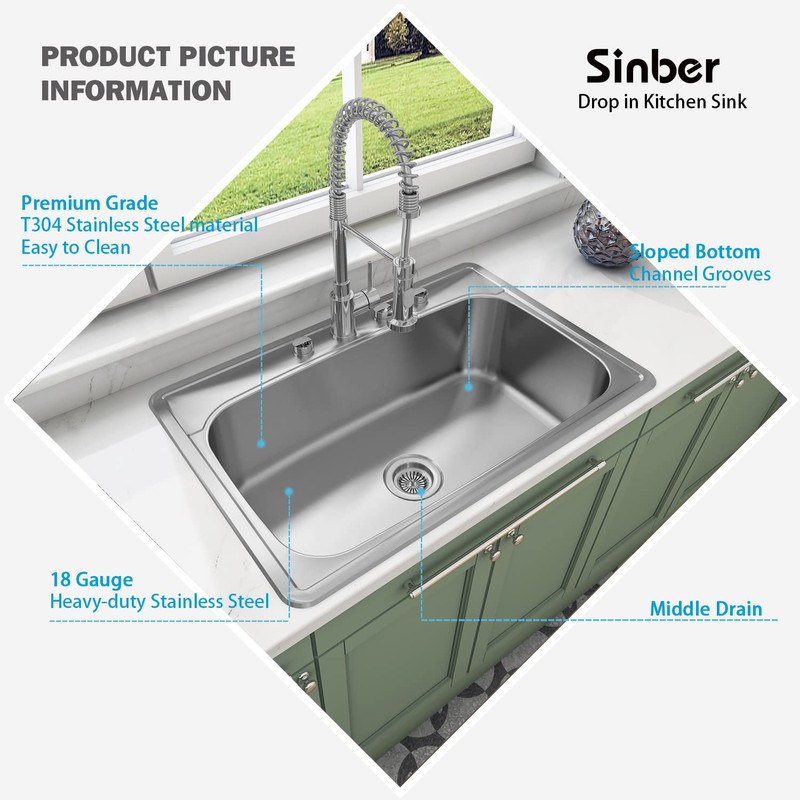 Introducing the Sinber Drop-in Single Bowl Kitchen Sink, a versatile and practical addition to your kitchen space. This sink is designed to provide convenience, durability, and functionality for all your kitchen tasks.The spacious single bowl offers ample room for washing dishes, prepping ingredients, and even soaking large pots and pans. Its Drop in installation creates a seamless look with your countertop, maximizing your counter space and creating a clean and streamlined aesthetic.Crafted from high-quality 18 gauge 304 stainless steel with a satin finish, this sink is built to withstand daily use and resist scratches, stains, and dents. Its durable construction ensures long-lasting performance and easy maintenance.The Sinber Drop-in Single Bowl Kitchen Sink is perfect for any corner of your kitchen, offering flexibility in installation. Its versatile design allows you to optimize your counter space and create an efficient workspace.This sink is compatible with a variety of kitchen gadgets and accessories, such as plunger clips, dish drying racks, and bar setups. It provides the functionality and flexibility you need to enhance your kitchen experience.Upgrade your kitchen with the Sinber Drop in Single Bowl Kitchen Sink and enjoy the perfect combination of style, utility, and convenience. Its sleek and modern design adds a touch of elegance to any kitchen decor while offering a practical and efficient workspace.