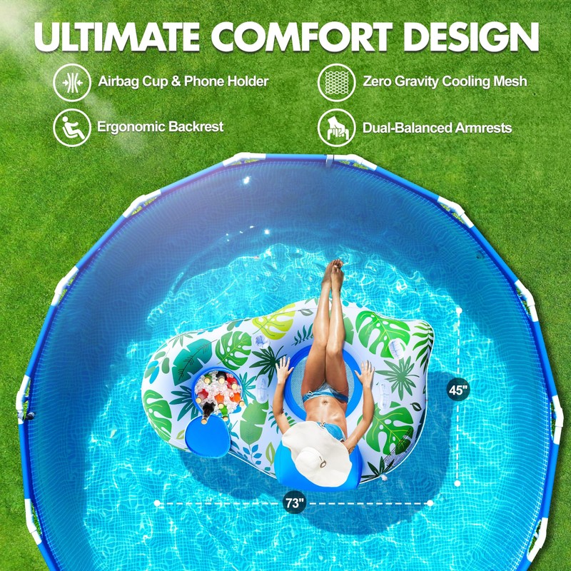 - Ultra Comfortable Floating Pool Chair: The size of our water float is 73*45*23'', which provides plenty of space for you to stretch out. The supportive backrest and the mesh bottom enhance the relaxation experience, allowing you to float comfortably in the sun for hours while staying cool in the water. The handles on both sides add stability on the water and make it easy to get on and off. Using our float will bring you an extremely comfortable and convenient floating experience.