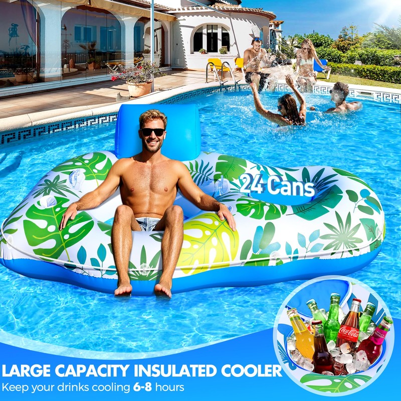 - Pool Float with Insulated Cooler: Sinbyuer pool float with cooler is our innovative design for 2025. With just some ice cubes, the cooler's insulation keeps salads, fruits, and beverages cold for 6-8 hours and holds up to 12 cans so you don't have to go back to shore for snacks, enhancing your floating experience! Plus, this cooler can also be used as a storage space for the speaker. Multiple coolness and relaxation give you a refreshing summer water entertainment.