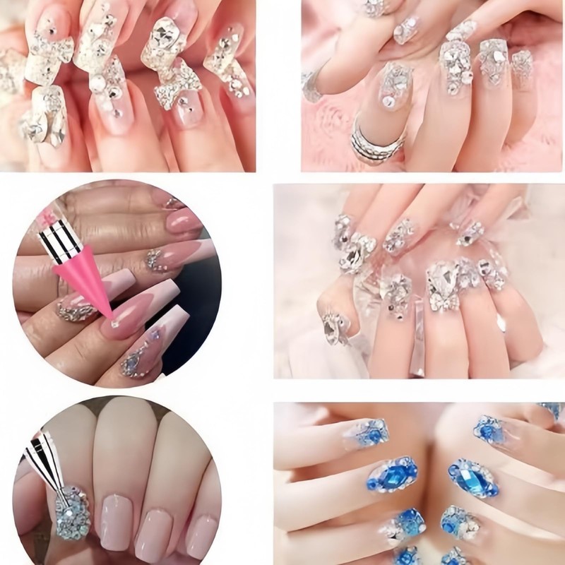 Use the wax tip to pick up rhinestones, then use the precision tip or tweezers to position and secure them on the nail.