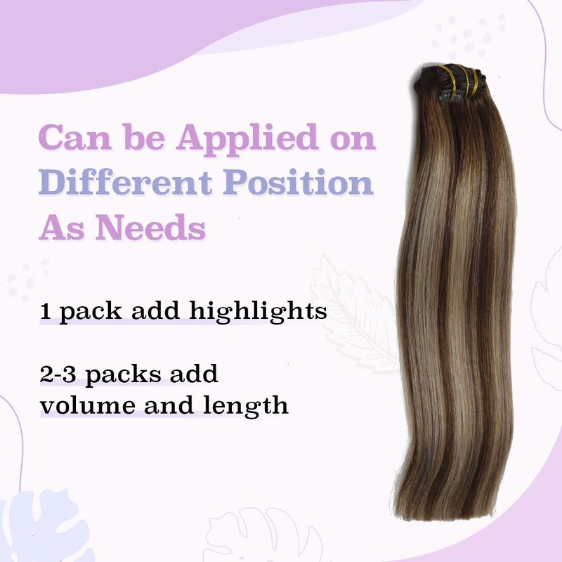 - Clip in Hair Extensions Specification-- Each clip in hair extensions comes with 6pcs of sewn on to ultra soft weft for maximum comfort and wearability 14-16 inch is 100g/pack 18 20 22 inch is 120g/pack More flexible to use, you can take only few pieces to change local effect or you can wear all clip ins to get fuller and longer hair looking
