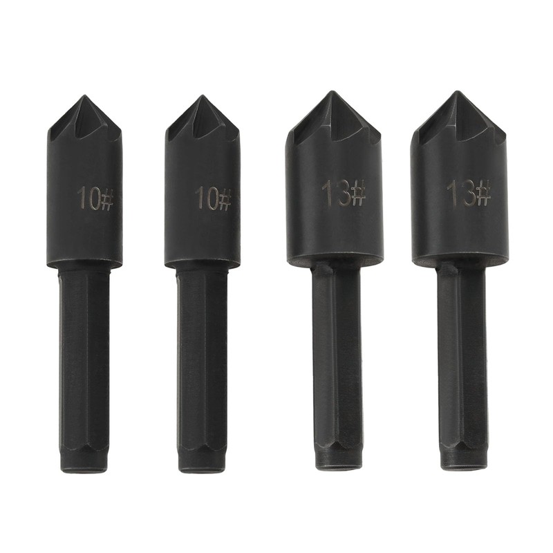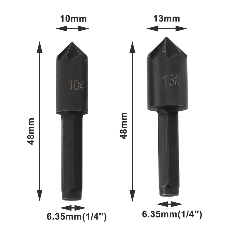 - Versatile Chamfer Tool: With a hex shank size of 1/4-inch (6.4mm) and featuring 4 cutting edges of 2pcs 10mm and 2pcs 13mm, our countersink bits are perfect for chamfering, deburring, and countersinking tasks.