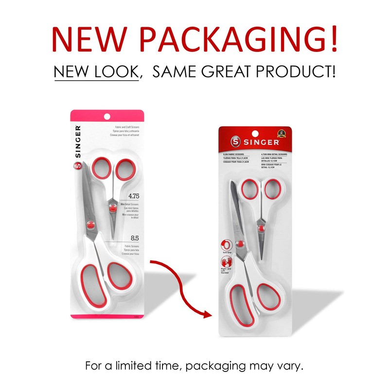The SINGER Fabric & Craft Scissors Combo Pack is the perfect sewing kit addition, allowing you to tackle the large and small details. Use the 8.5 inch shears to glide through any fabric easily and the smaller ones for precision in detail work. The fabric and craft scissors feature soft, rubberized pink and white handles. The rubber allows you to hold the scissors in comfort for extended periods of time. Stainless steel blades are strong and resistant to rust, dings and scratches. Both shears are designed to be used by left- or right-handed individuals, making this set perfect for the whole family. This package contains one pair of 8.5 inch lightweight scissors and one pair of 4.75 inch detail scissors, both featuring rubber grips to ease hand strain and pressure. Imported.