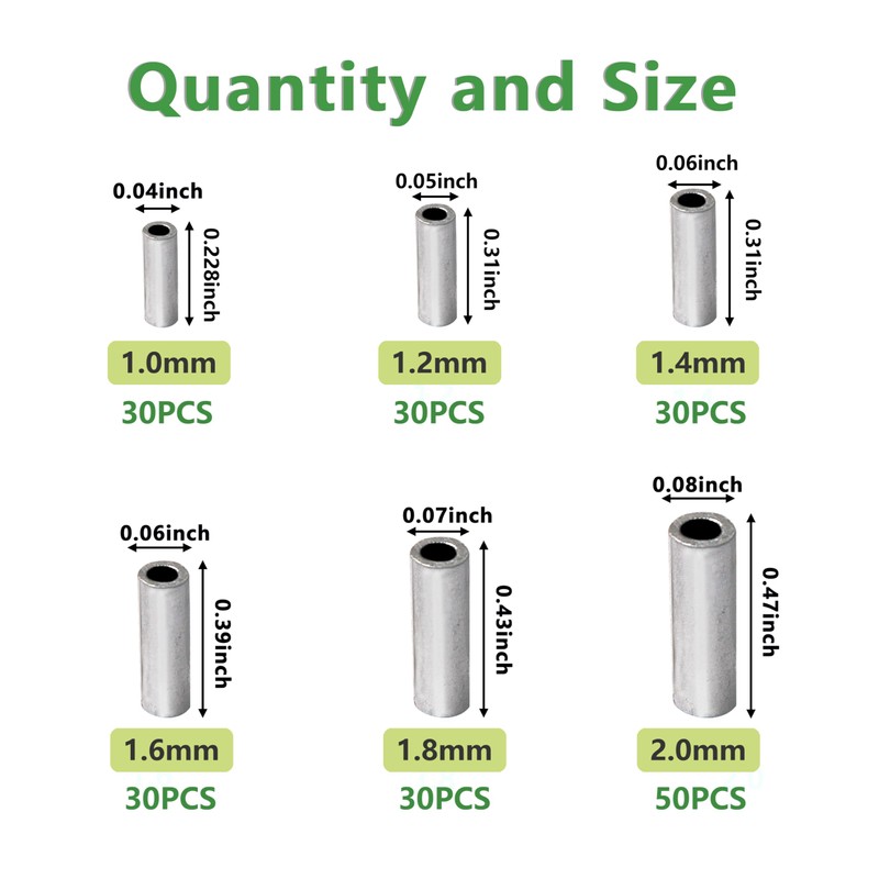 • Multi Size: 200pcs fishing wire single crimp sleeves in handy box, 6 various size: 1.0mm(30pcs), 1.2mm(30pcs), 1.4mm(30pcs), 1.6mm(30pcs), 1.8mm(30pcs), 2.0mm(50pcs).