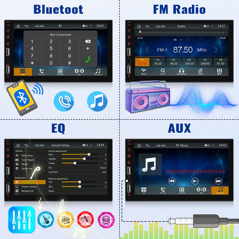 • FM Radio / EQ Adjustment: Single din Apple CarPlay radio with FM tuner, digital high quality stereo with 18 preset stations for news, music and weather broadcast. Equalizer - Customize how you want to hear your music with the balance / fader / bass and treble, adjust to Pop, Classic, Jazz and Rock style