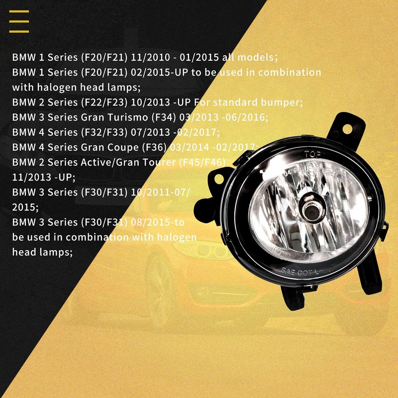 - Exact OEM fit: Direct fit for BMW 3 Series F30/F31 11-15; 3 Series F30/F31 15-up used in combination with halogen head lamps; 3 Series Gran Turismo F34 13-16; 1 Series F20/F21 10-15 all models; 1 Series F22 0/F21 15-UP used in combination with halogen head lamps; 4 Series F32/F33 13-17; 4 Series Gran Coupe F36 14-17; 2 Series Active/Gran Tourer F45/F46 13-UP; 2 Series F22/F23 13-UP For standard bumper. The fog lights have been sold unit: left side (driver side (driver e)