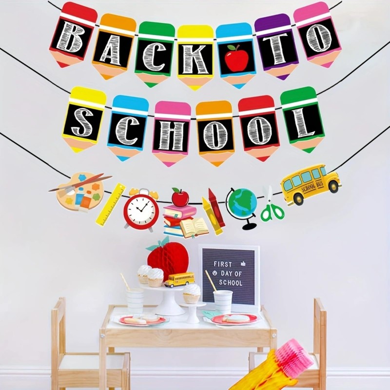 - Back to School Sign: Includes all necessary hanging accessories with the banner, making it convenient for teachers to set up classroom decorations. Colourful and engaging welcome back to school banner ideal for creating an inviting learning environment for students. Constructed with quality materials to maintain its appearance throughout the school year and beyond. Ready-to-hang banner garland featuring school-themed elements including pencils, apples, school bus, and book designs for instant classroom decoration. Perfect for kindergarten and preschool classroom bulletin boards, doorways, and walls to create a welcoming back-to-school atmosphere